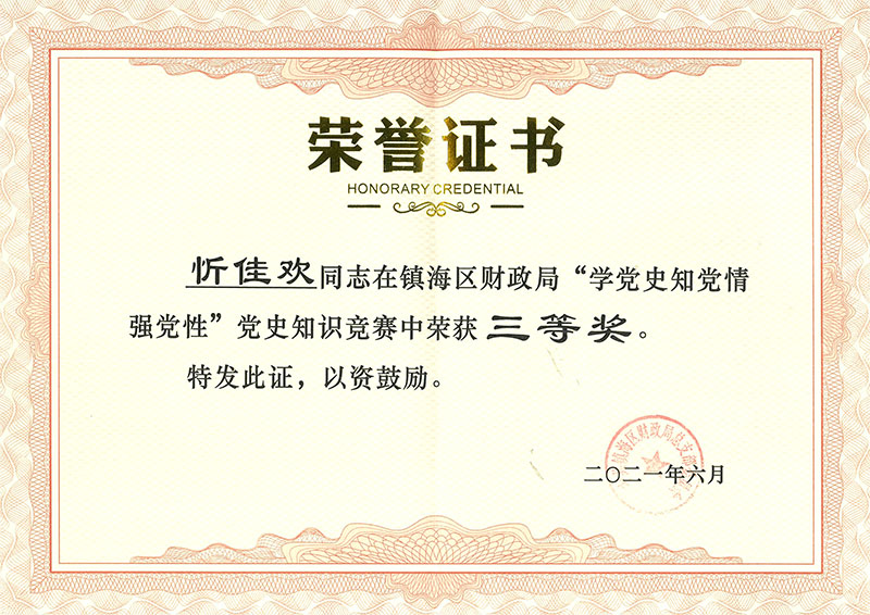 镇海区财政局党史知识竞赛三等奖——忻佳欢