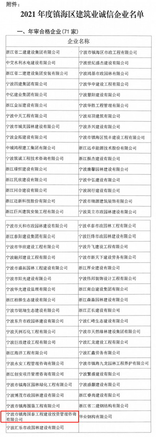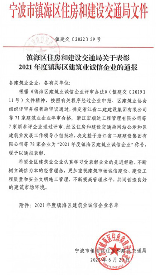 近日,宁波镇海区住房和建设交通局发布了《关于表彰2021年度镇海区建筑业诚信企业的通报》,宁波市镇海国泰工程建设投资管理咨询有限公司荣获“2021年度镇海区建筑业诚信企业”。这份荣誉是对镇海国泰的激励,镇海国泰必将坚持树立以人为本的经营理念,重视建筑市场的诚信建设、建设工程质量和安全文明施工管理,不断提高管理水平,共同营造良好的建筑市场环境。