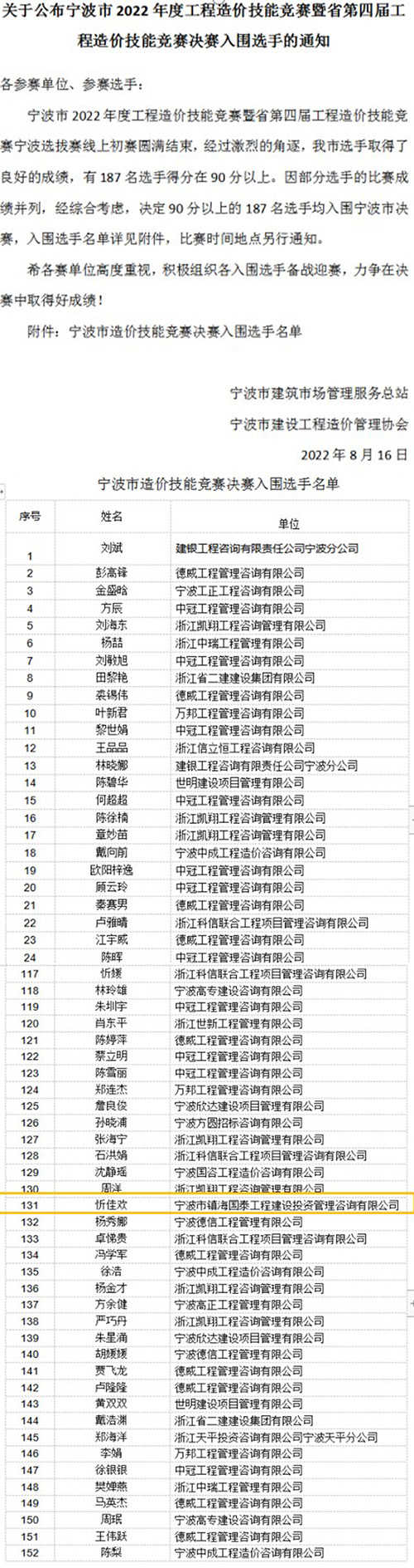 近日,宁波市2022年度工程造价技能竞赛暨省第四届工程造价技能竞赛宁波选拔赛线上初赛圆满结束,经过激烈的角逐,我单位忻佳欢取得了良好的成绩,入围宁波市决赛!希在决赛中取得好成绩!