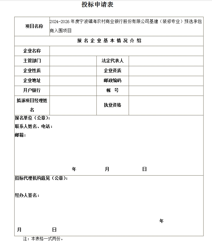 2.2招标内容:从事2024-2026年度宁波镇海农村商业银行股份有限公司基建(装修专业)施工项目的资格入围。