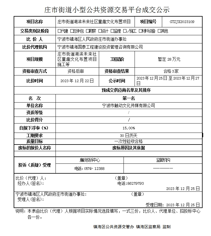 庄市街道湖滨未来社区童趣文化布置项目-预中标公示