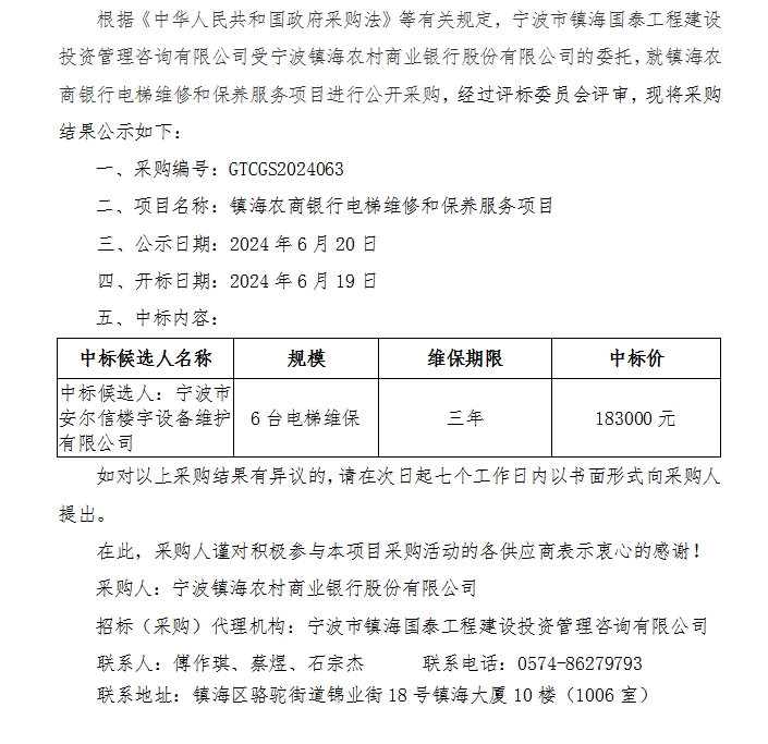 镇海农商银行电梯维修和保养服务项目采购结果公示